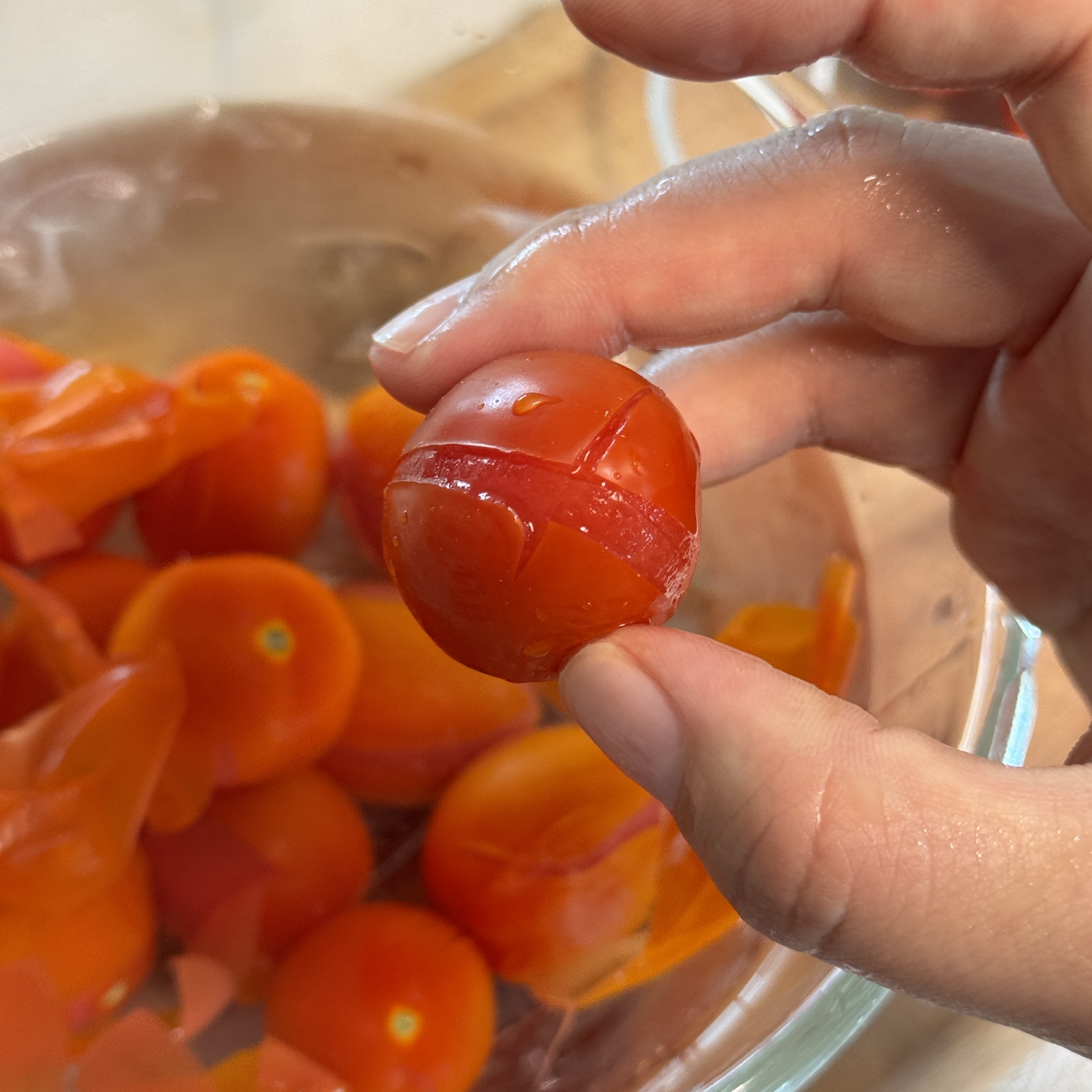 1. 방울토마토에 십자로 칼집을내고 뜨거운물에 1분 데쳐준다.