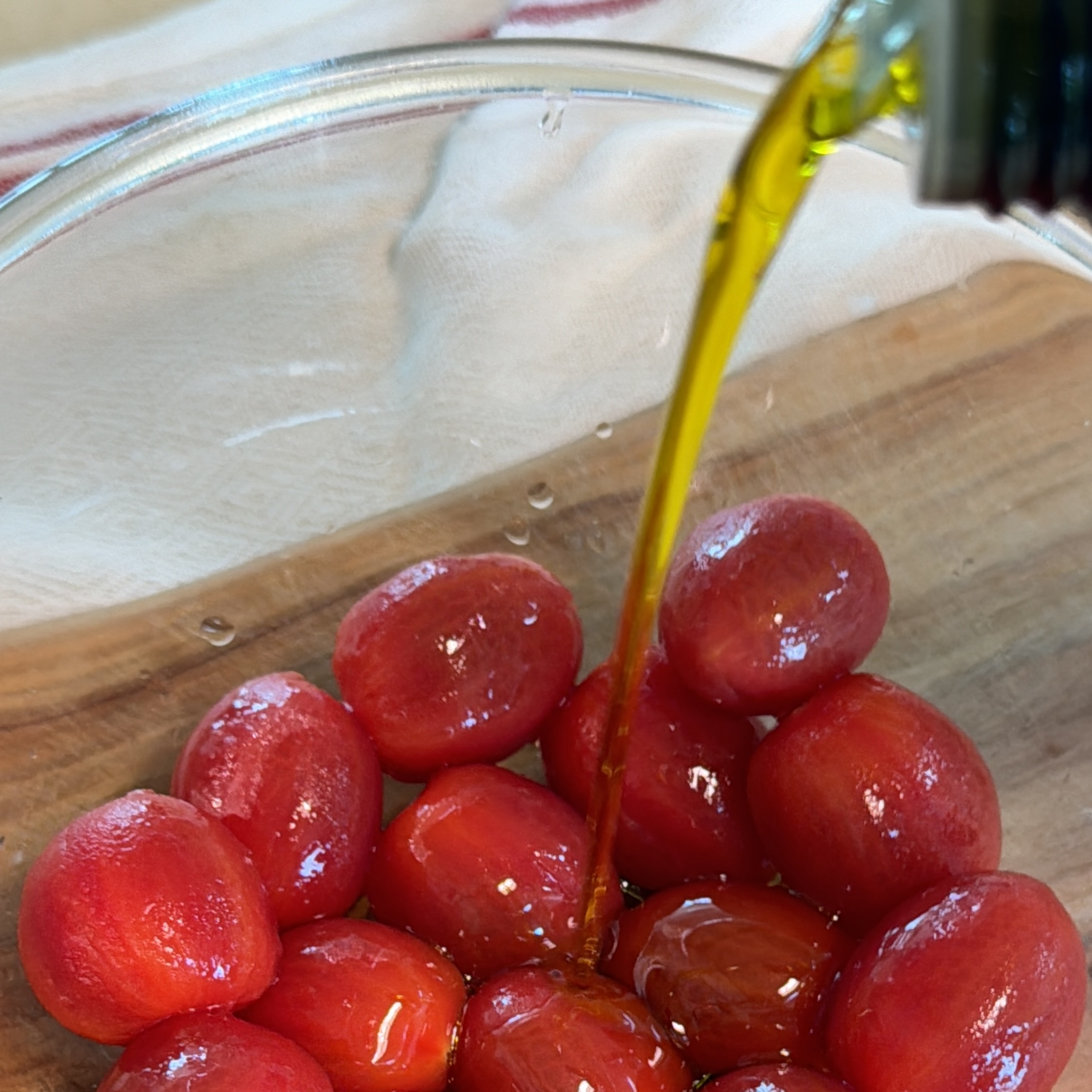 4. 껍질깐 방울토마토에 양념 재료를 계량해 넣고 잘 섞어준다.