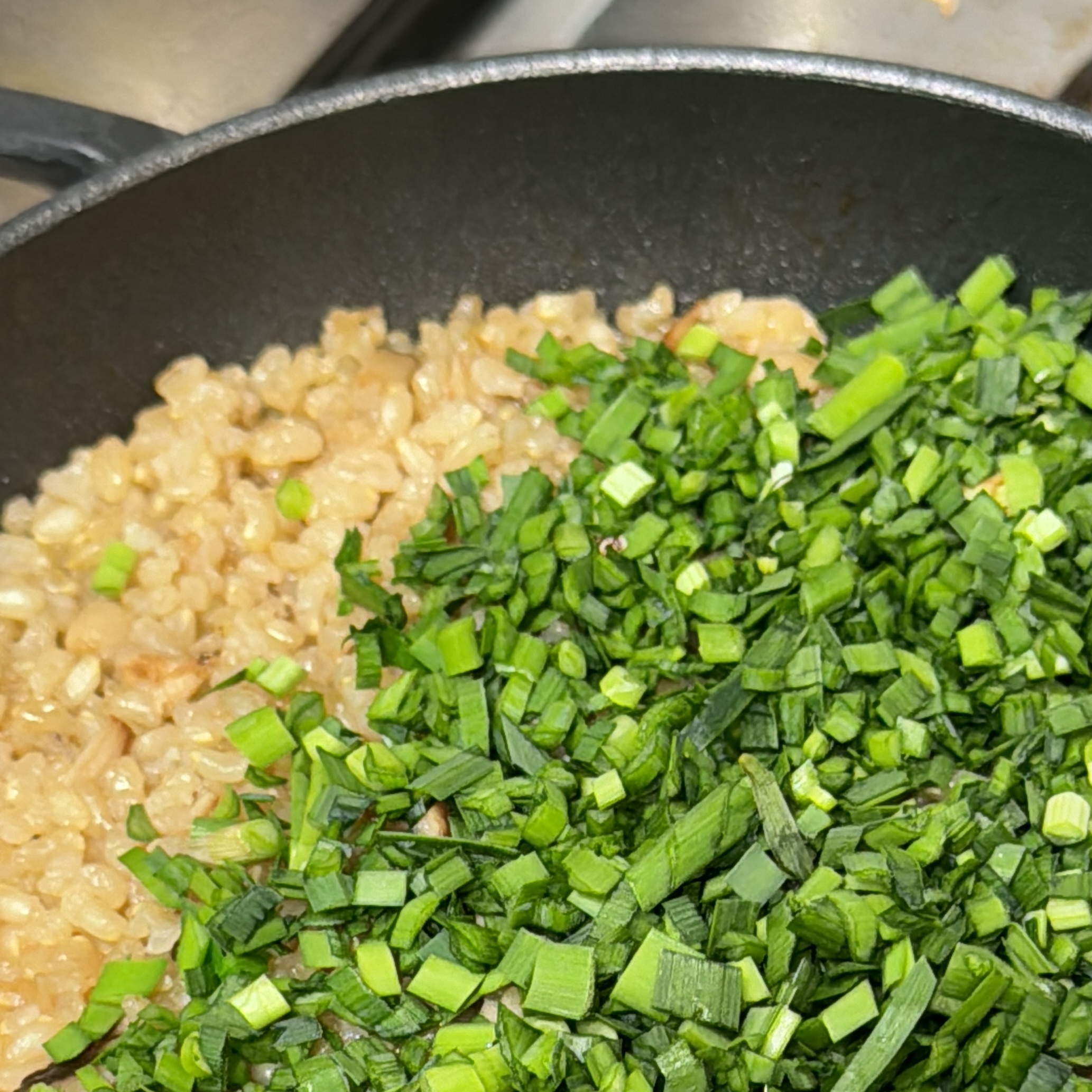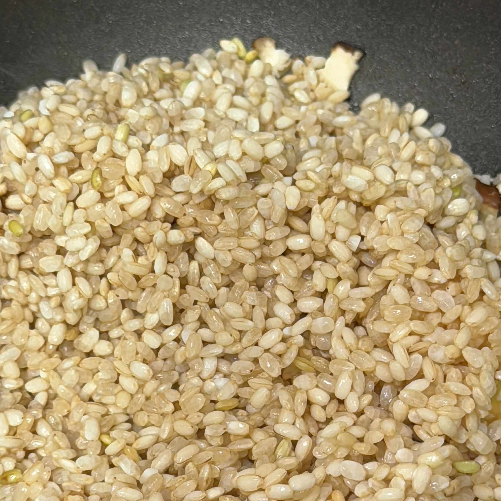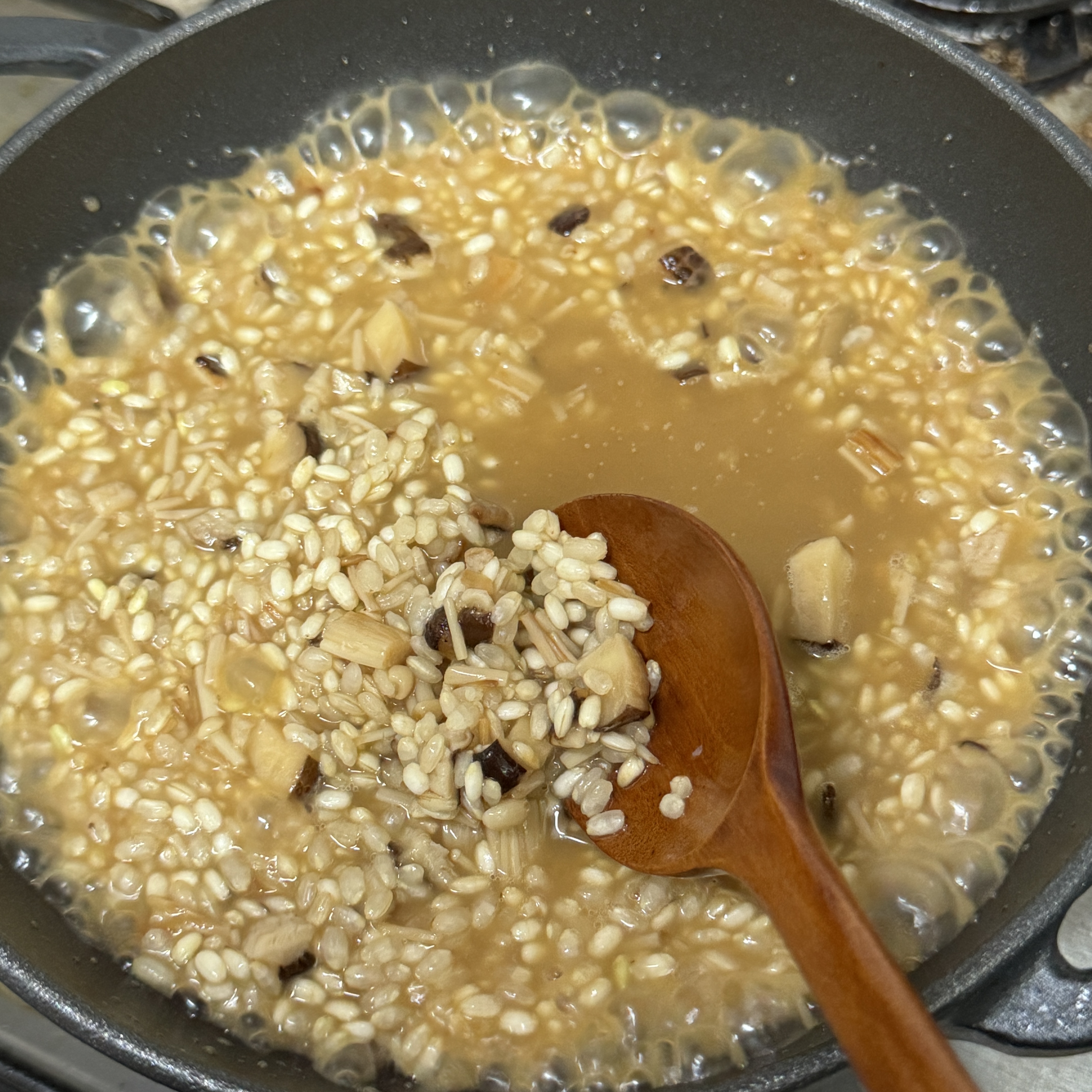 4. 버섯이 숨이 죽으면 불려놓은 쌀 한컵을 넣고 볶다가