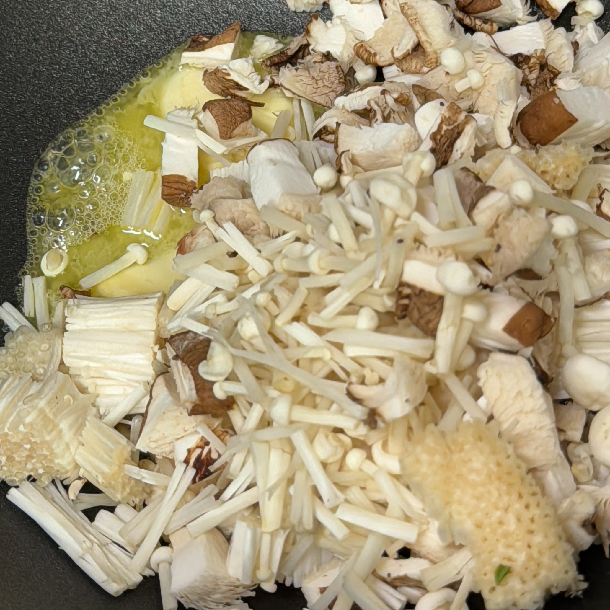 3.솥에 버터 한 조각 넣고 버섯을 노릇하게 볶아주세요.