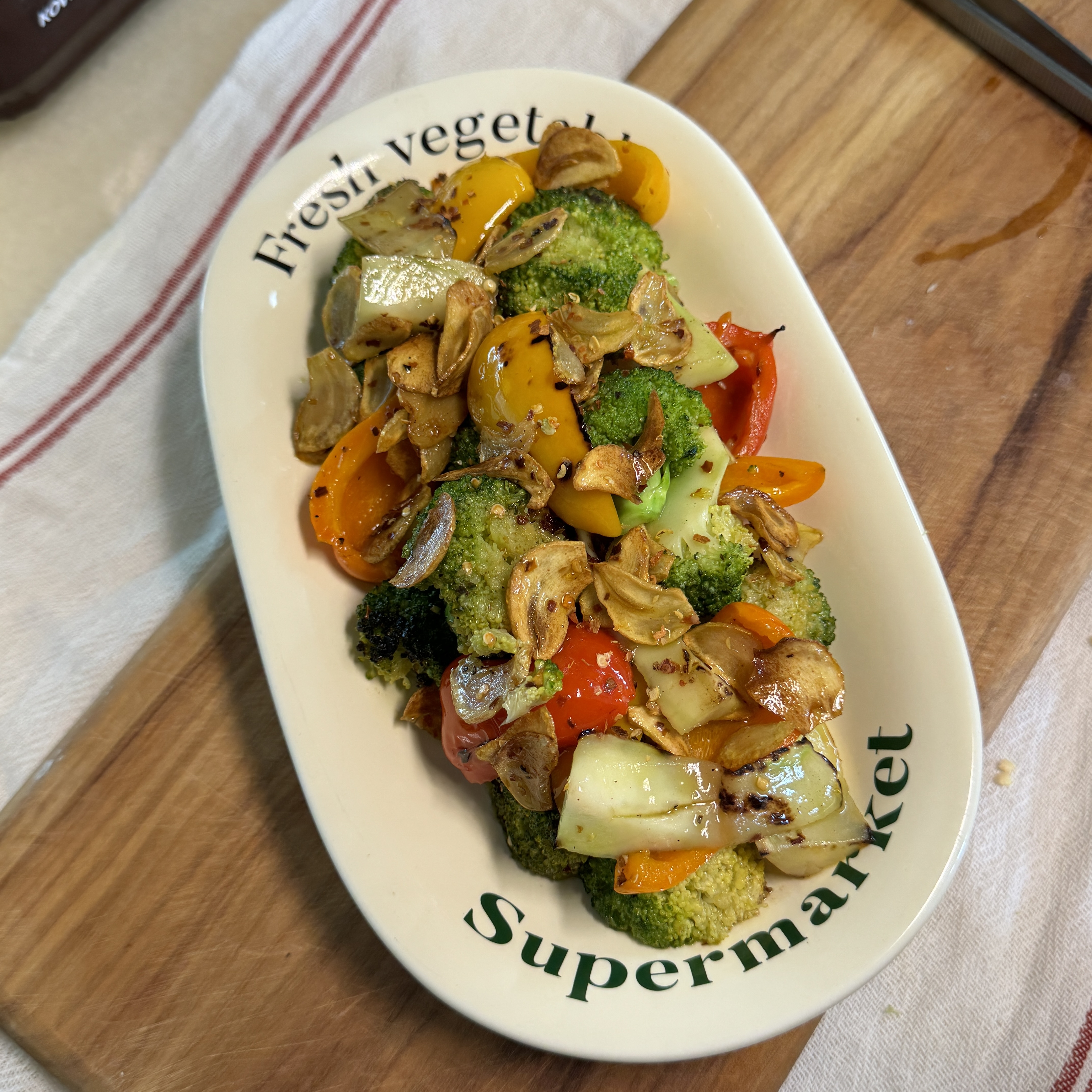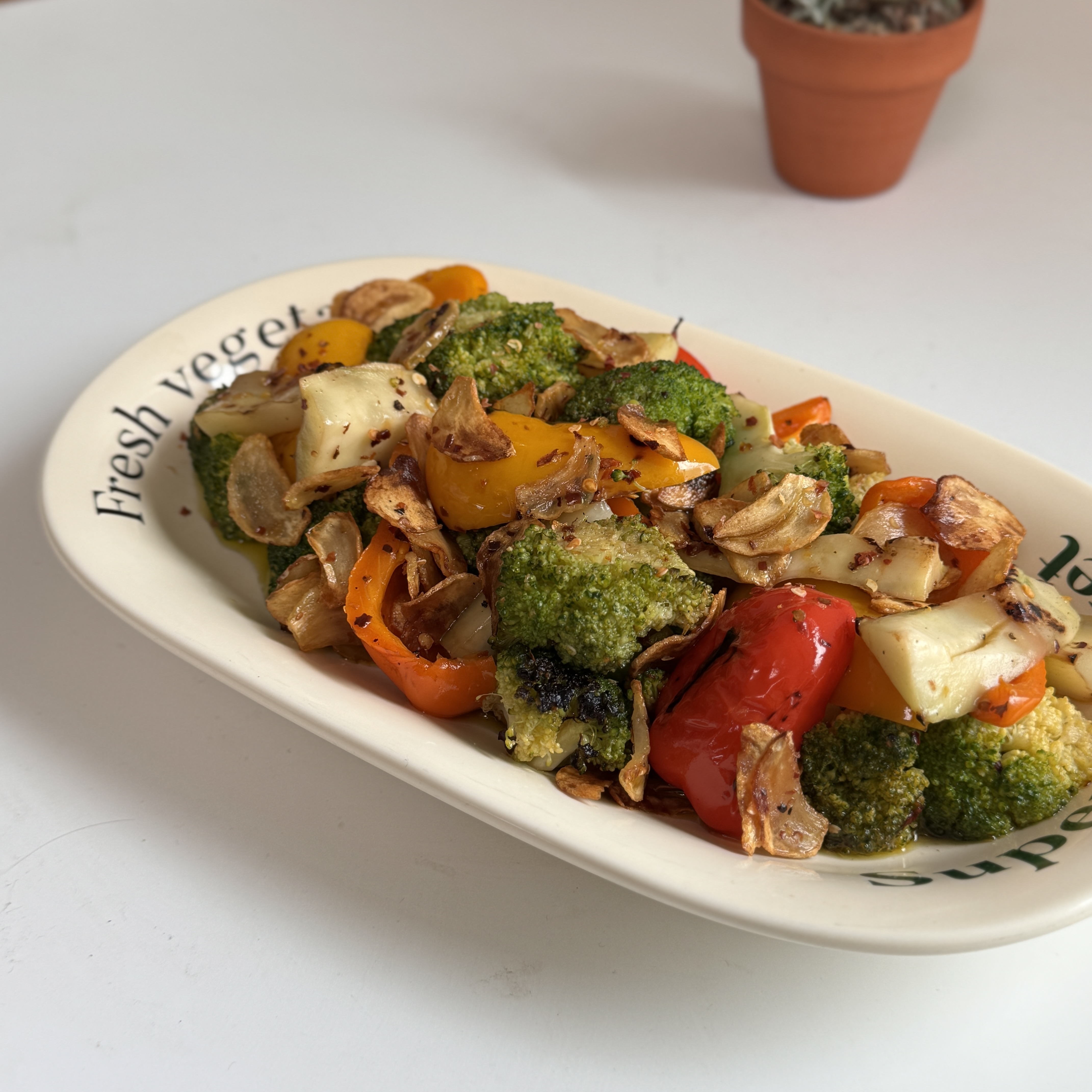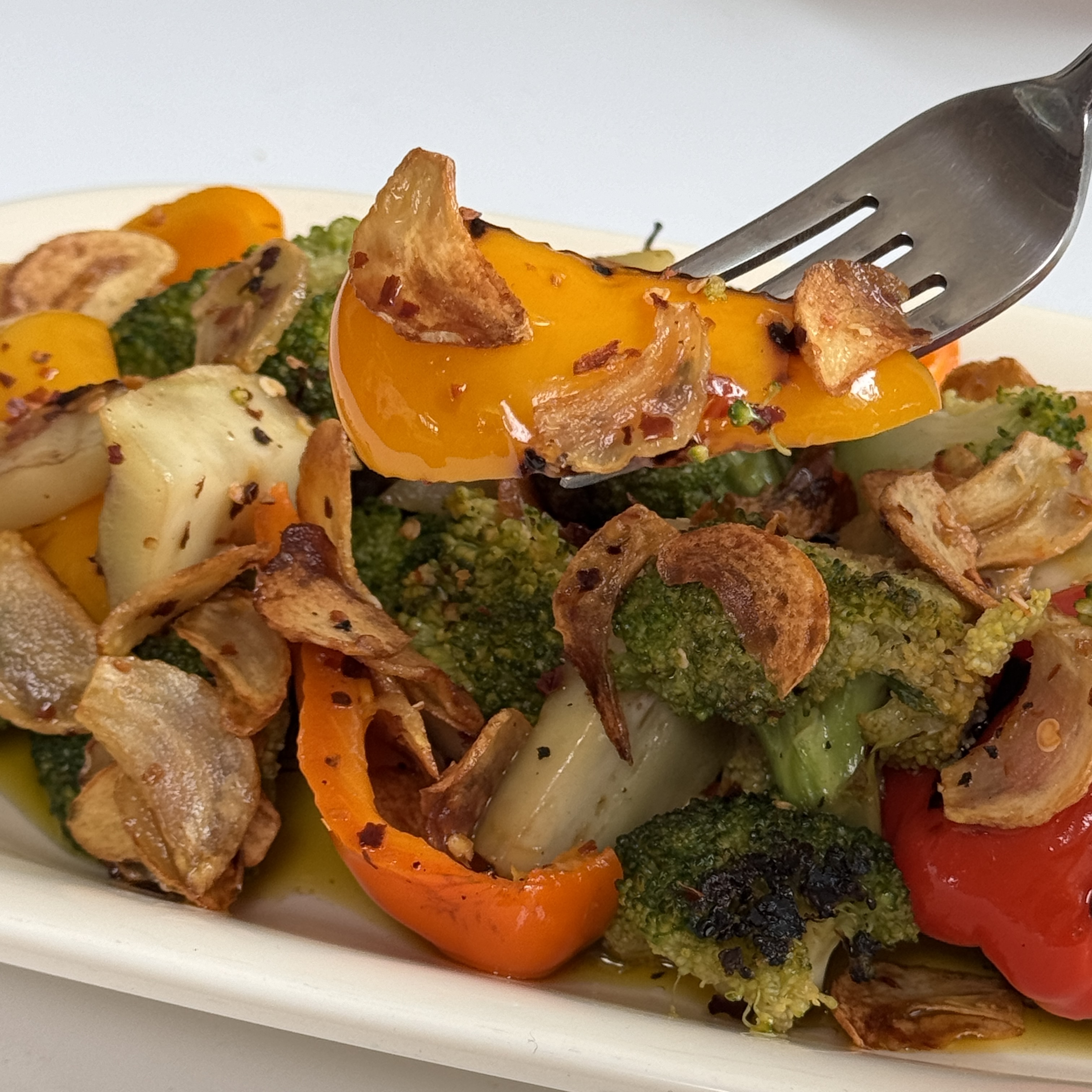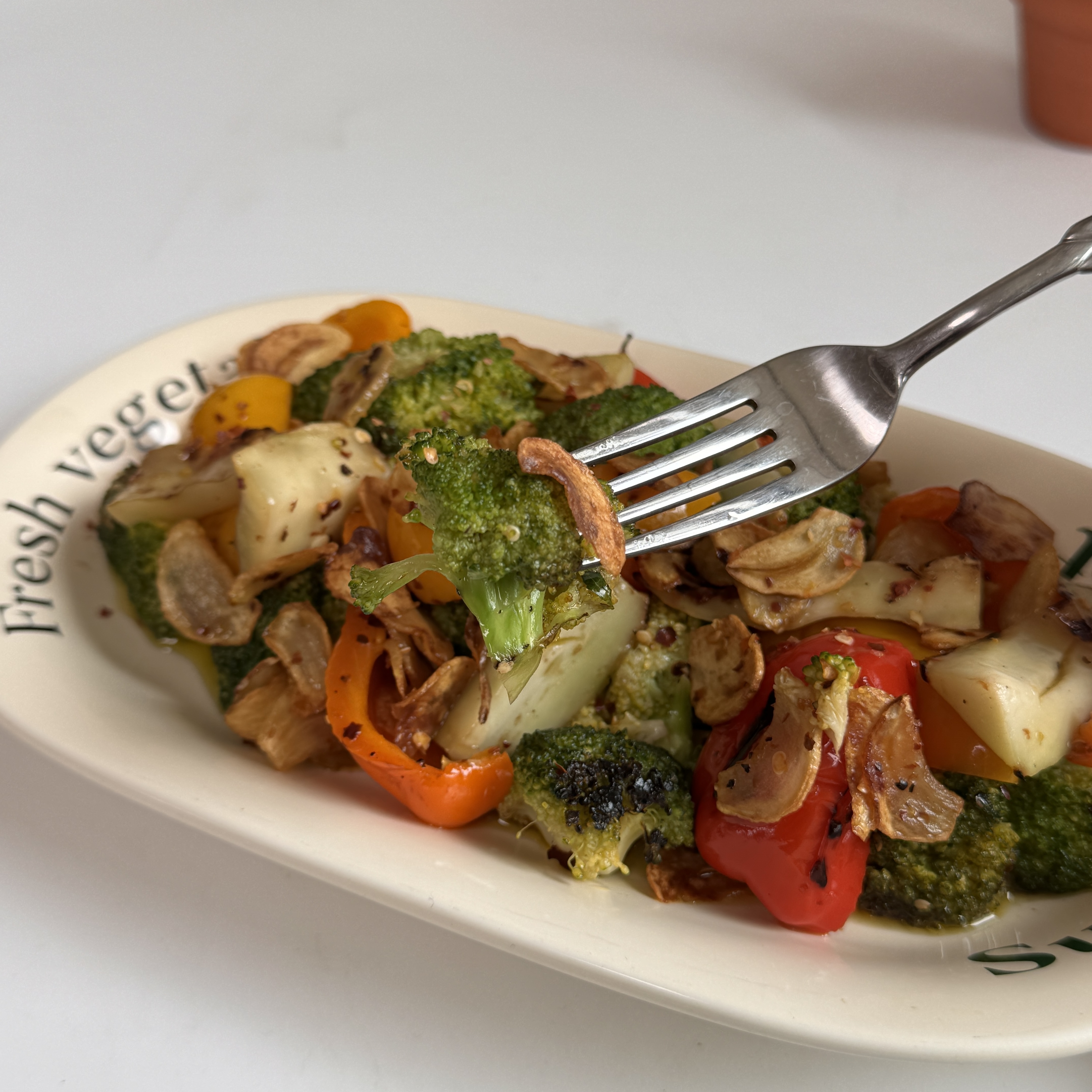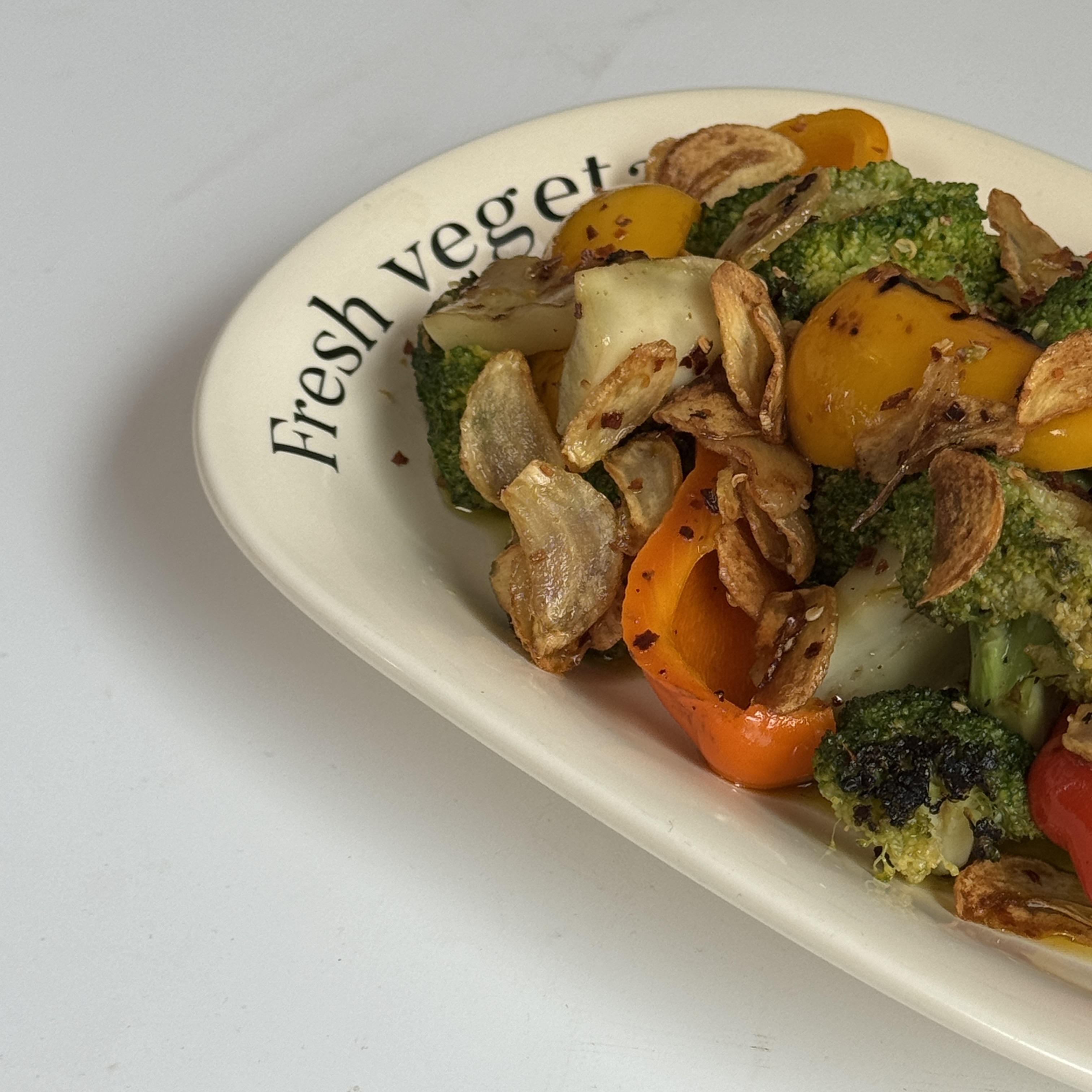 6. 완성 접시에 구운야채를 담아놓고 뜨거운 마늘기름을 위에 바로 부어준다.