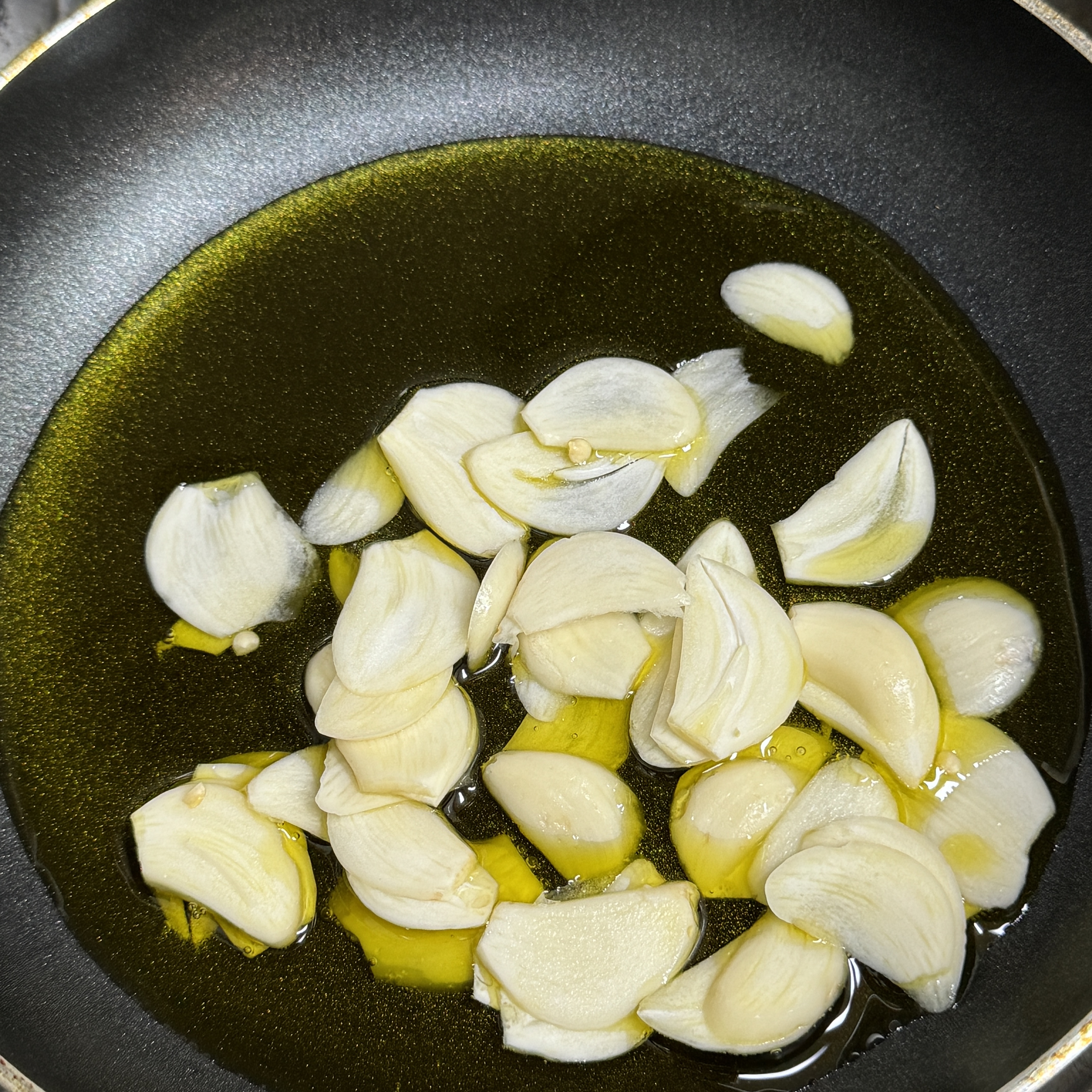 5. 야채가 구워지는 동안 약불에 올리브유와 편 썰어둔 마늘을 넣고