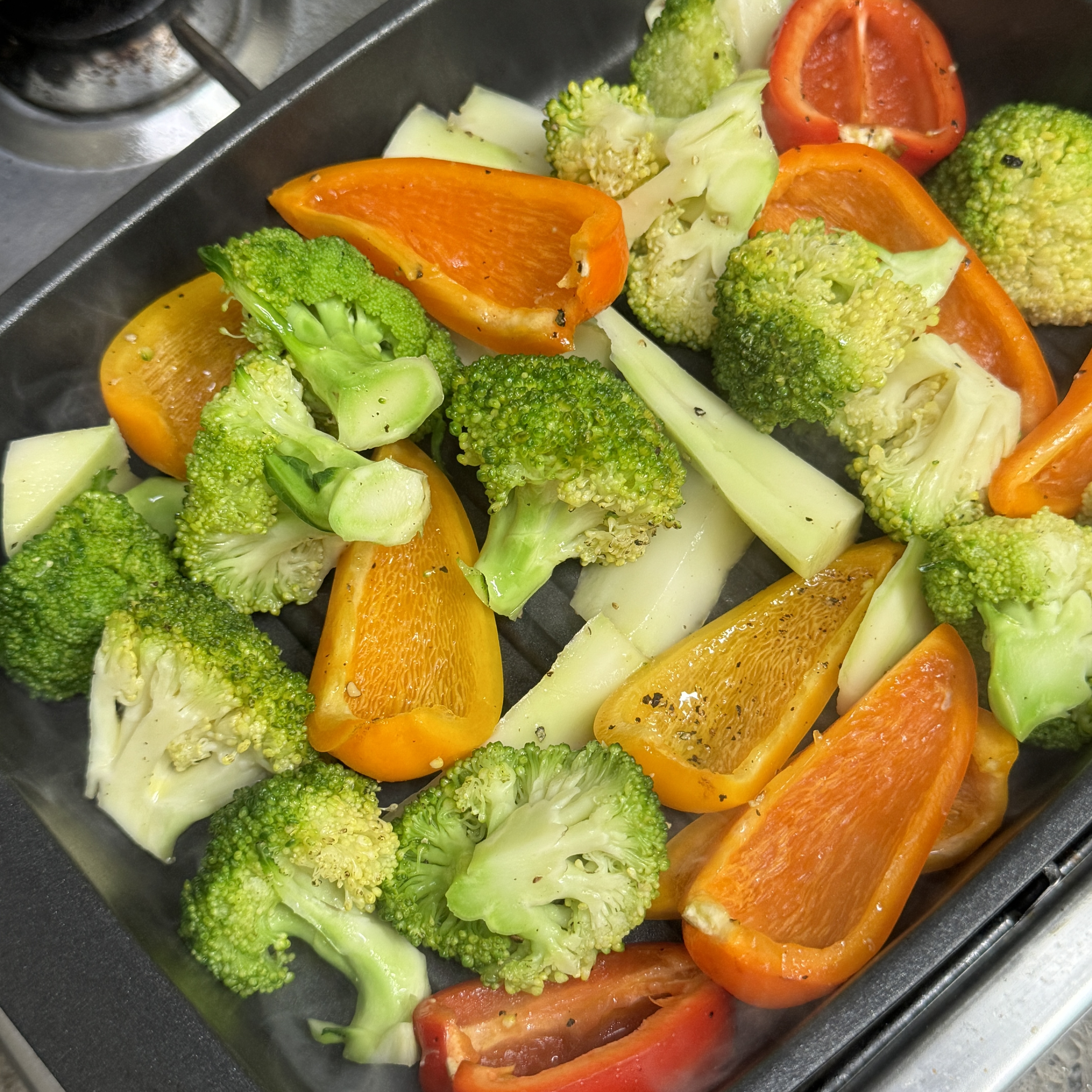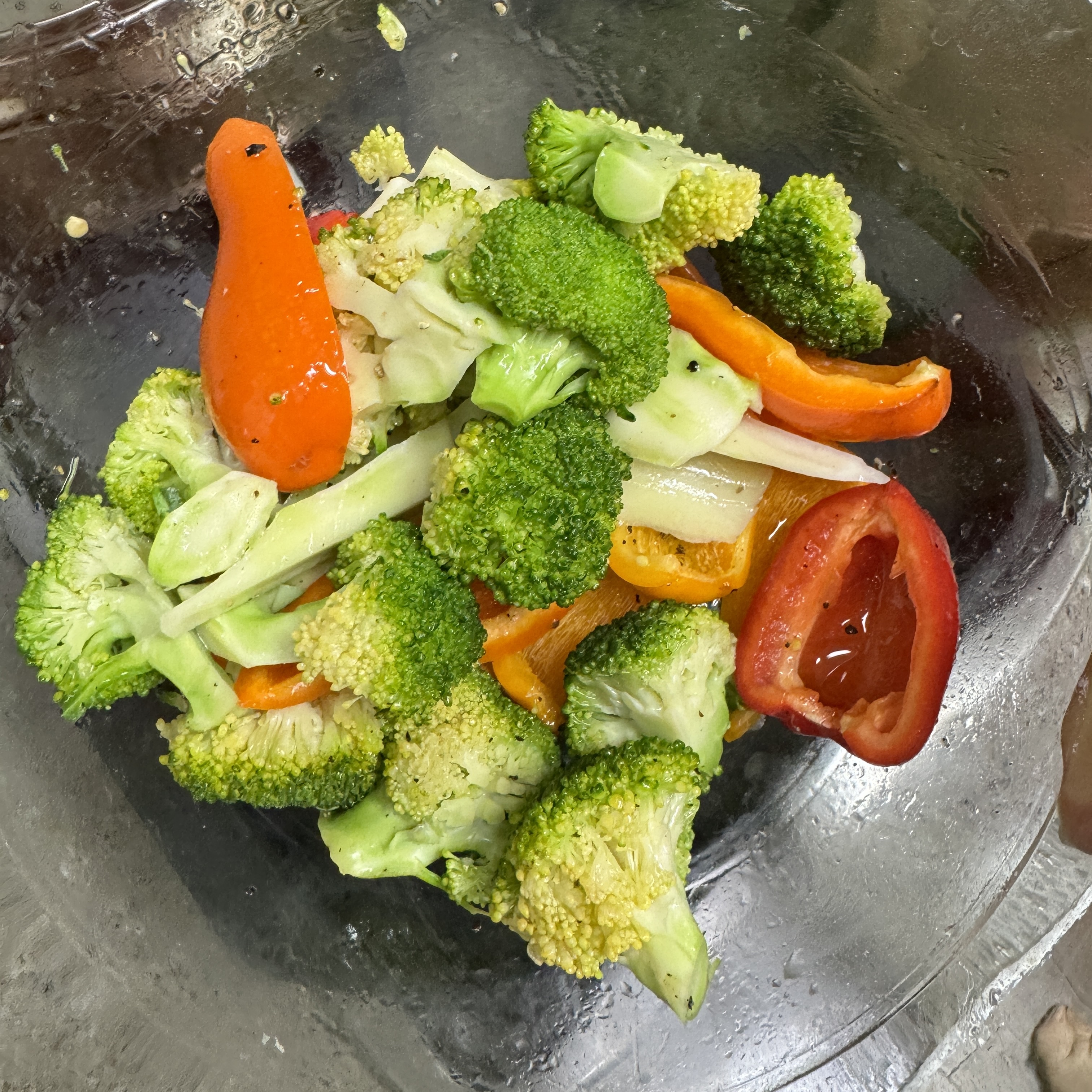3. 데친 브로콜리와 파프리카에 올리브유, 소금, 후추 넣고 잘 버무려준다.