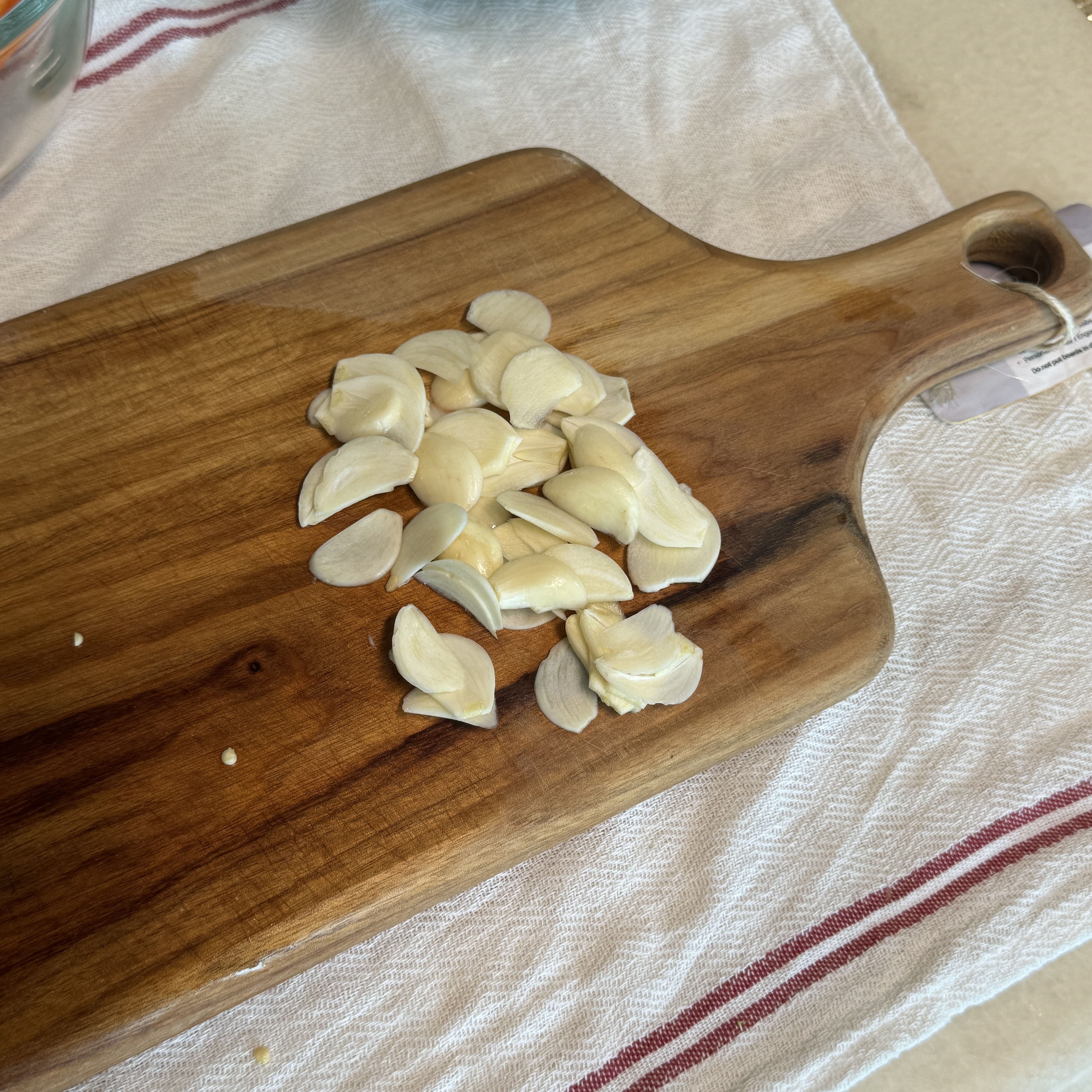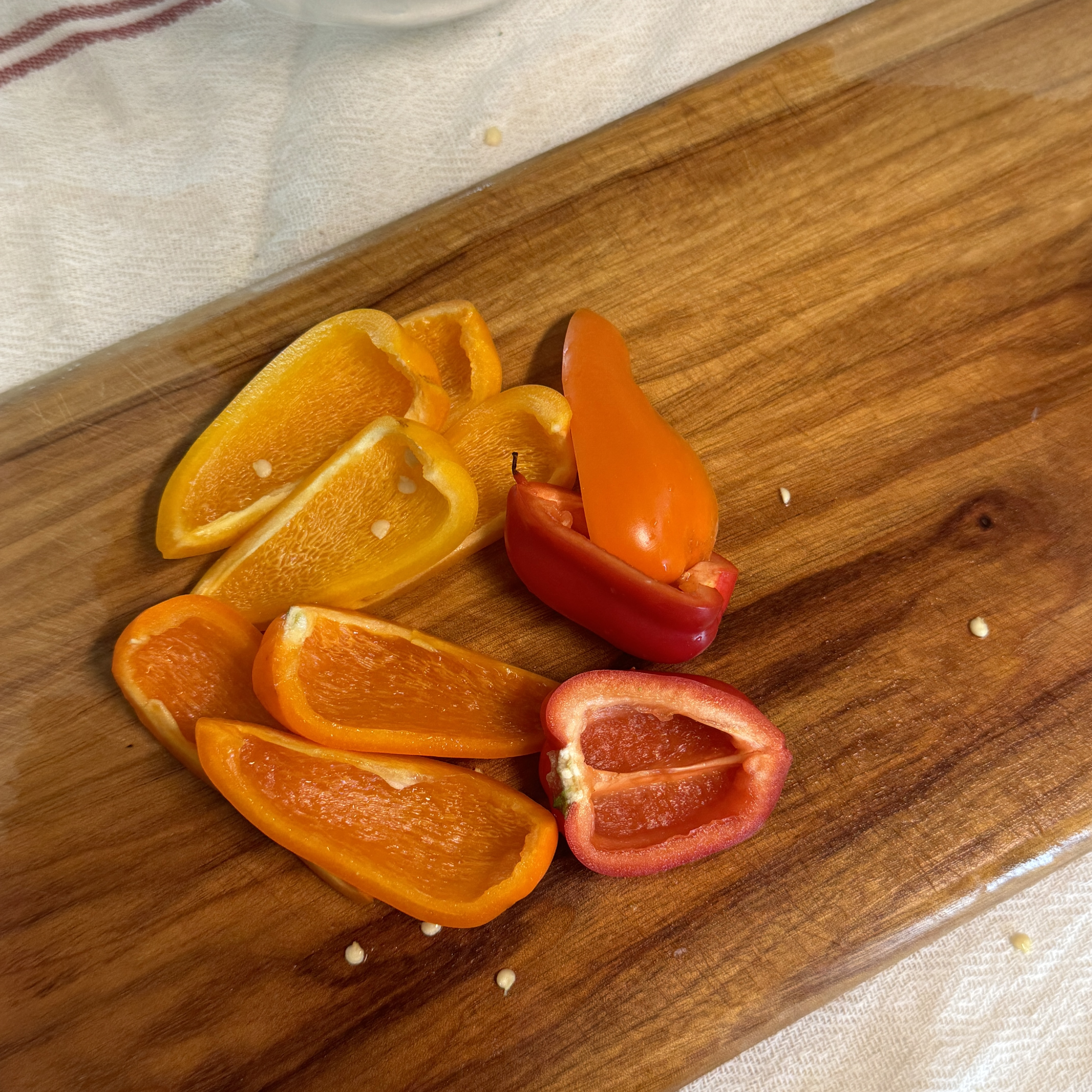 2. 마늘은 얇게 편썰어 주고 미니 파프리카는 먹기 좋은 크기로 썰어준다.