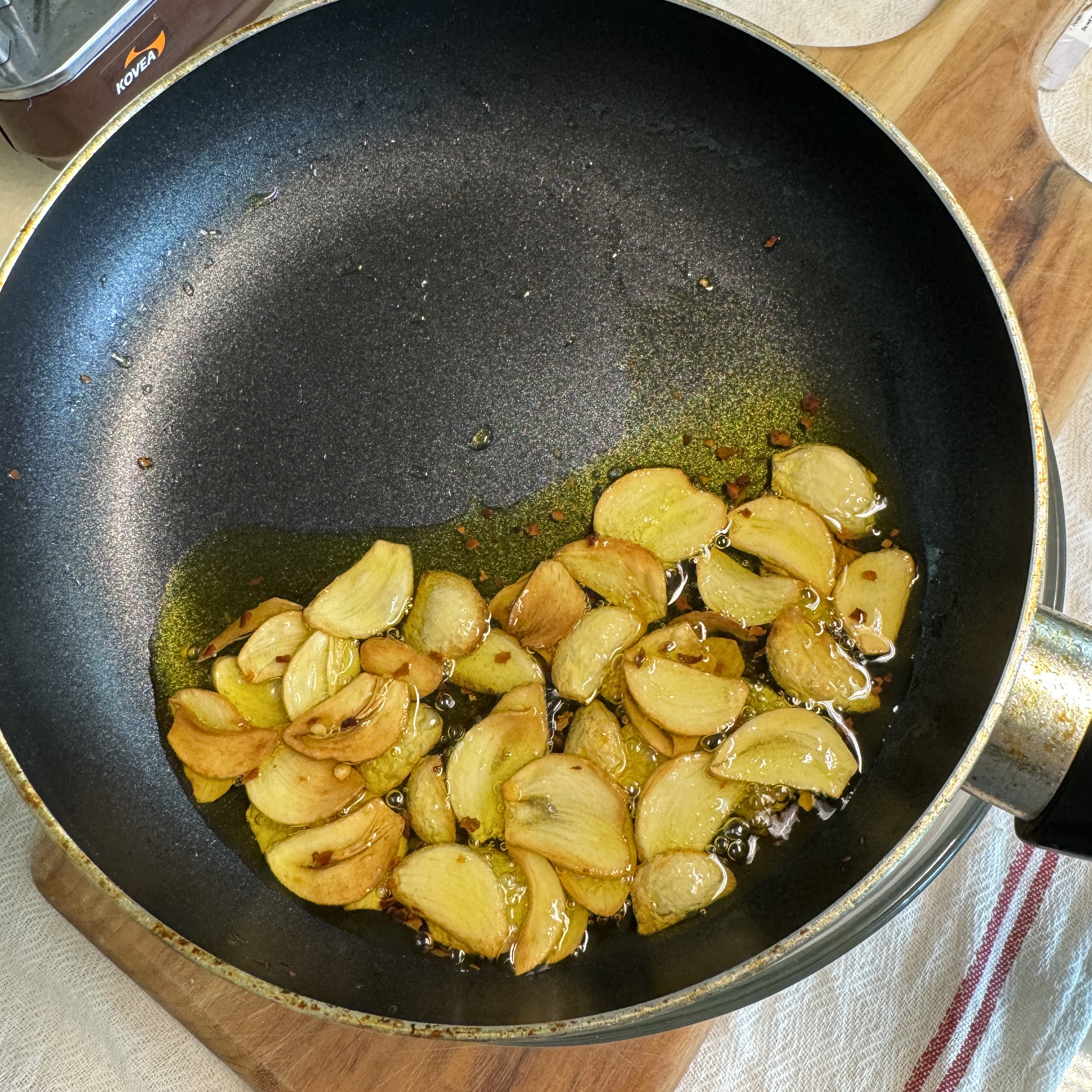 마늘의 겉면이 노르스름 해졌을 때 크러쉬드 레드페퍼를 마지막으로 넣고 바로 불을 끈다.