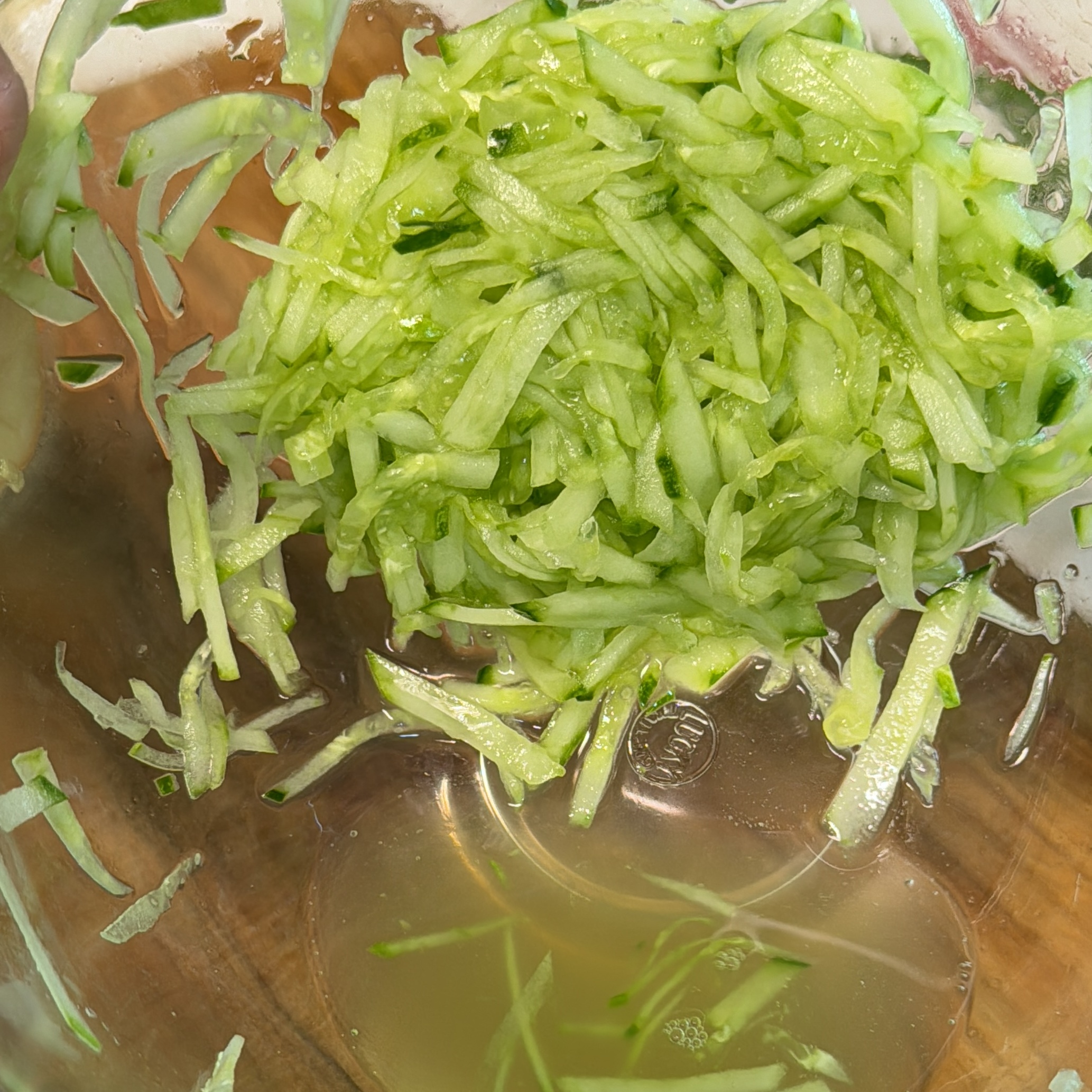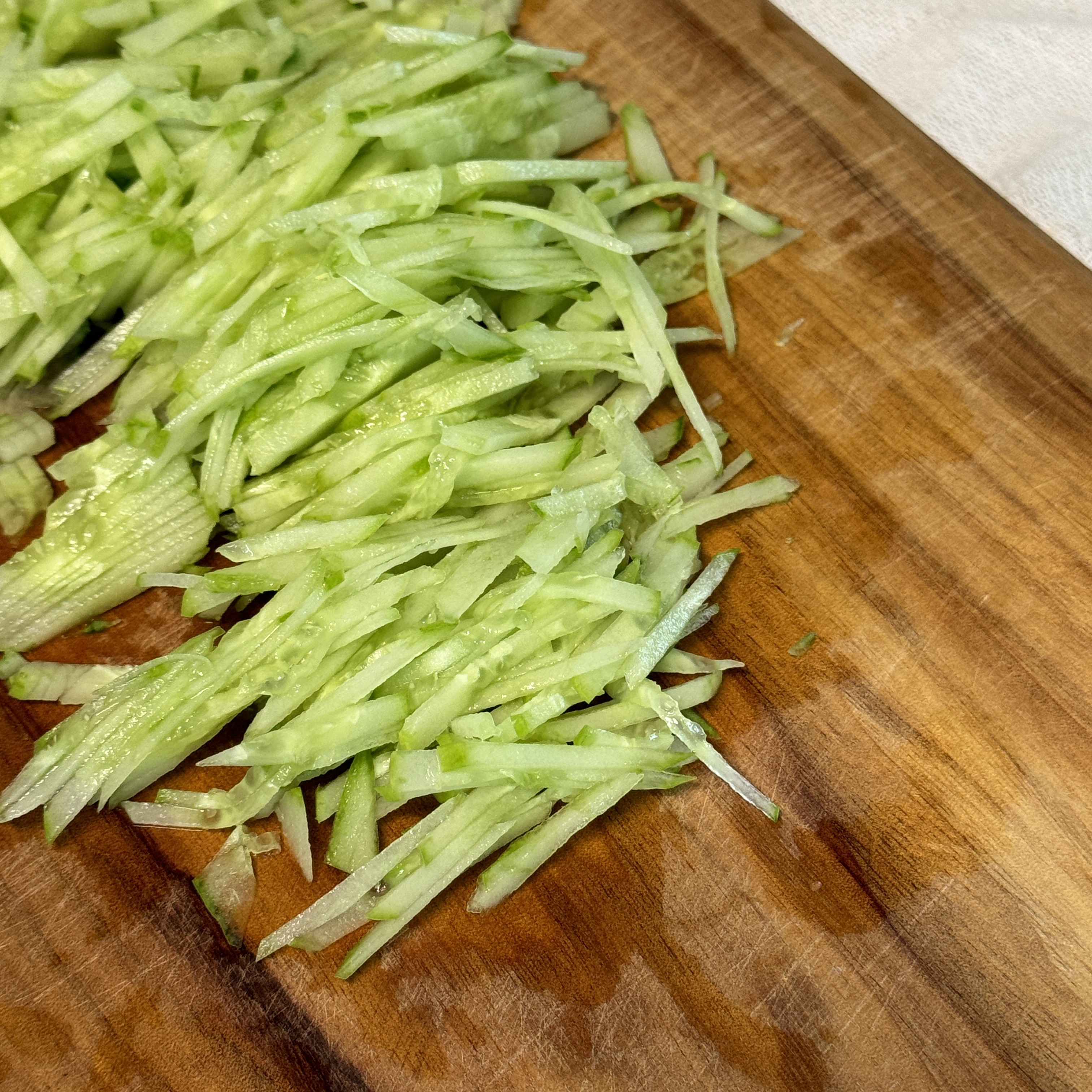 1. 오이는 잘 씻고 듬성듬성 껍질을 벗겨 채썰어 준다.