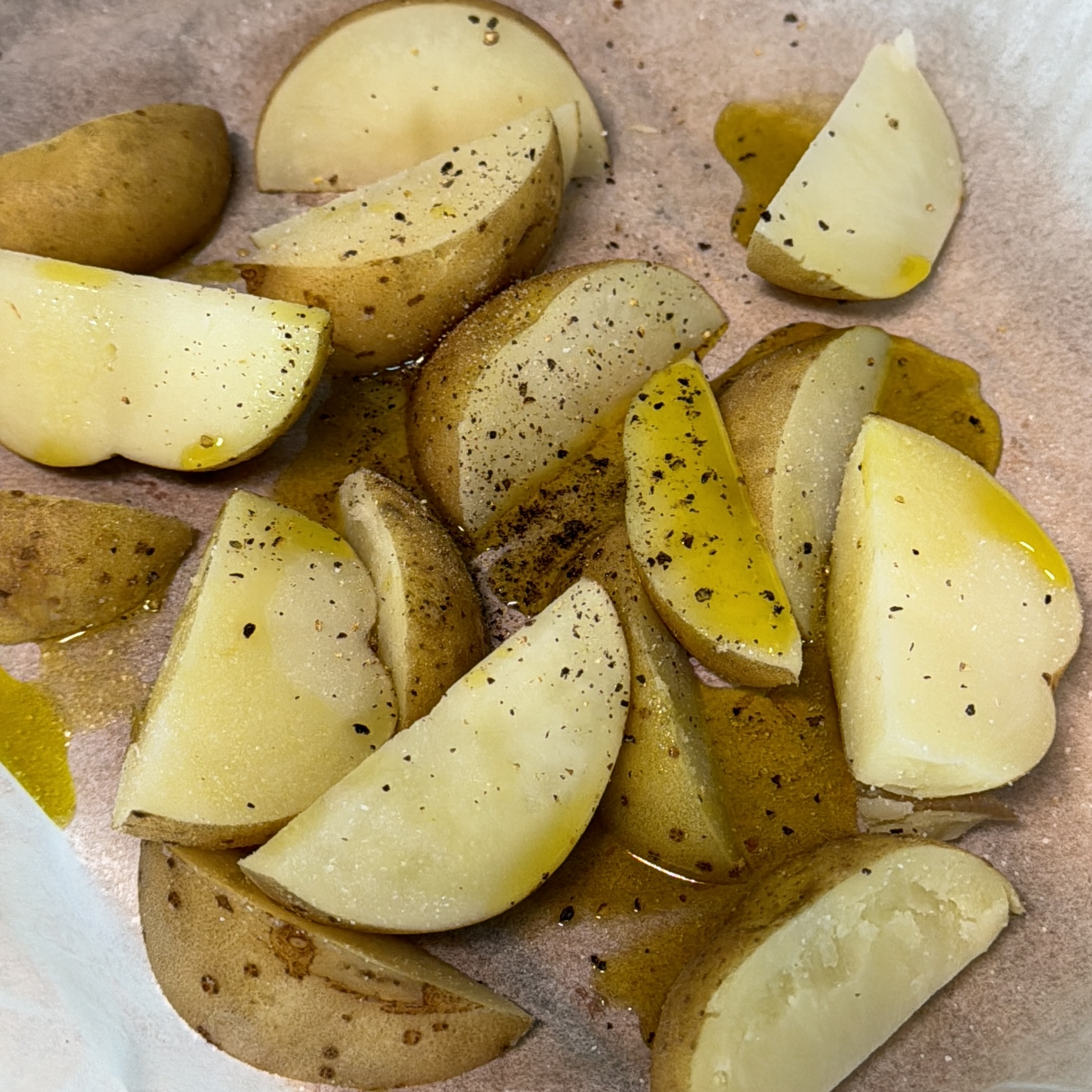4. 삶은 감자를 웻지 모양으로 썰어 올리브유, 소금, 후추 고루 발라