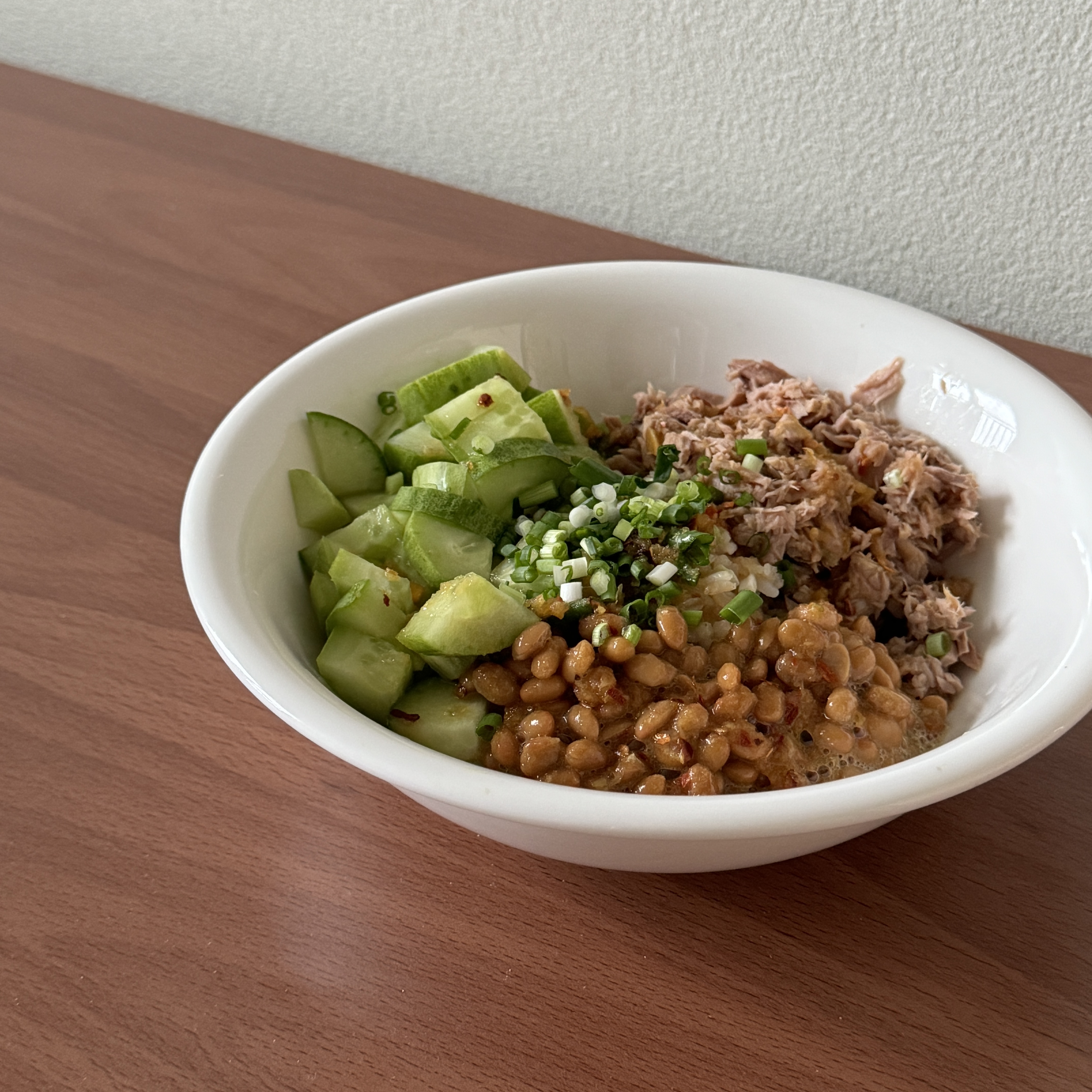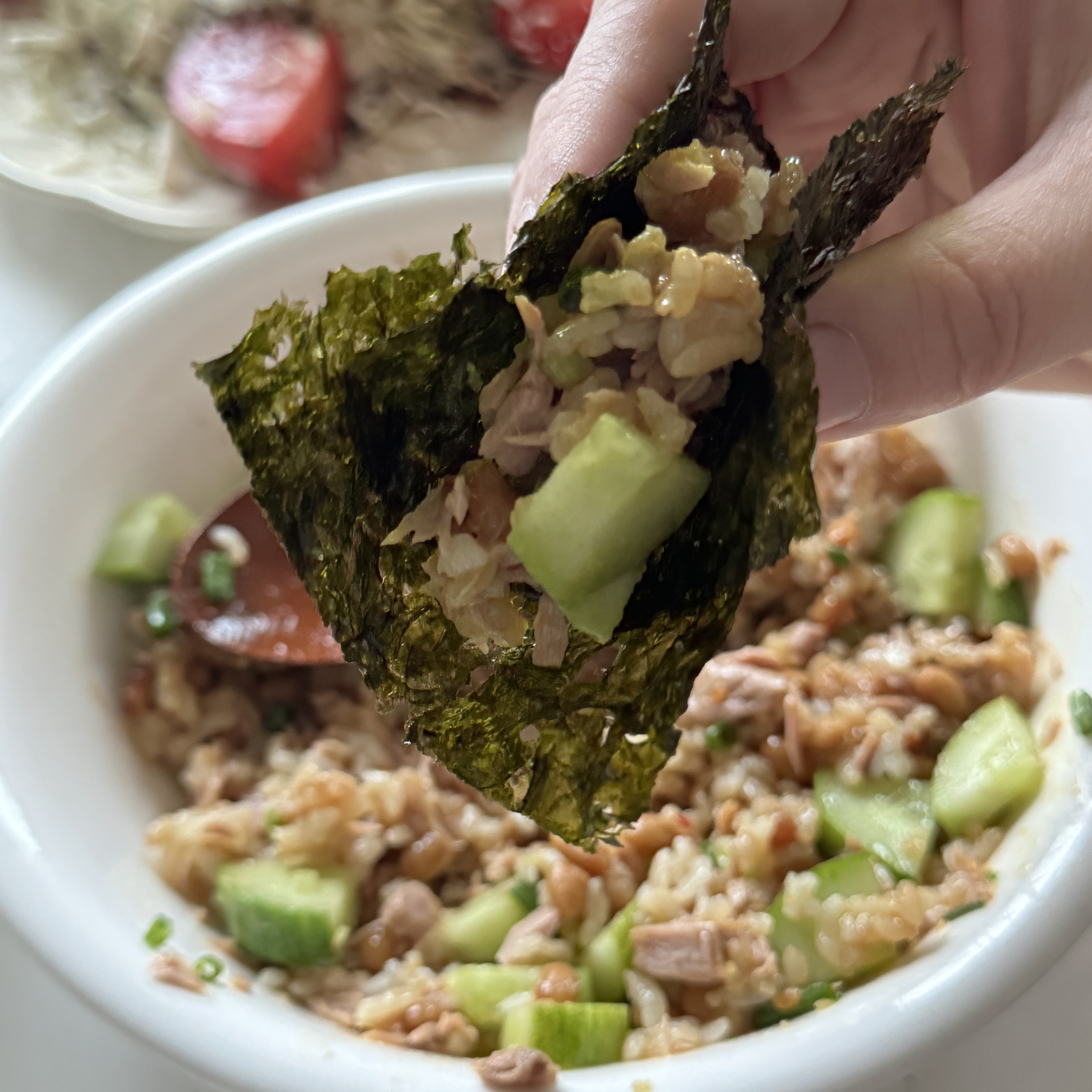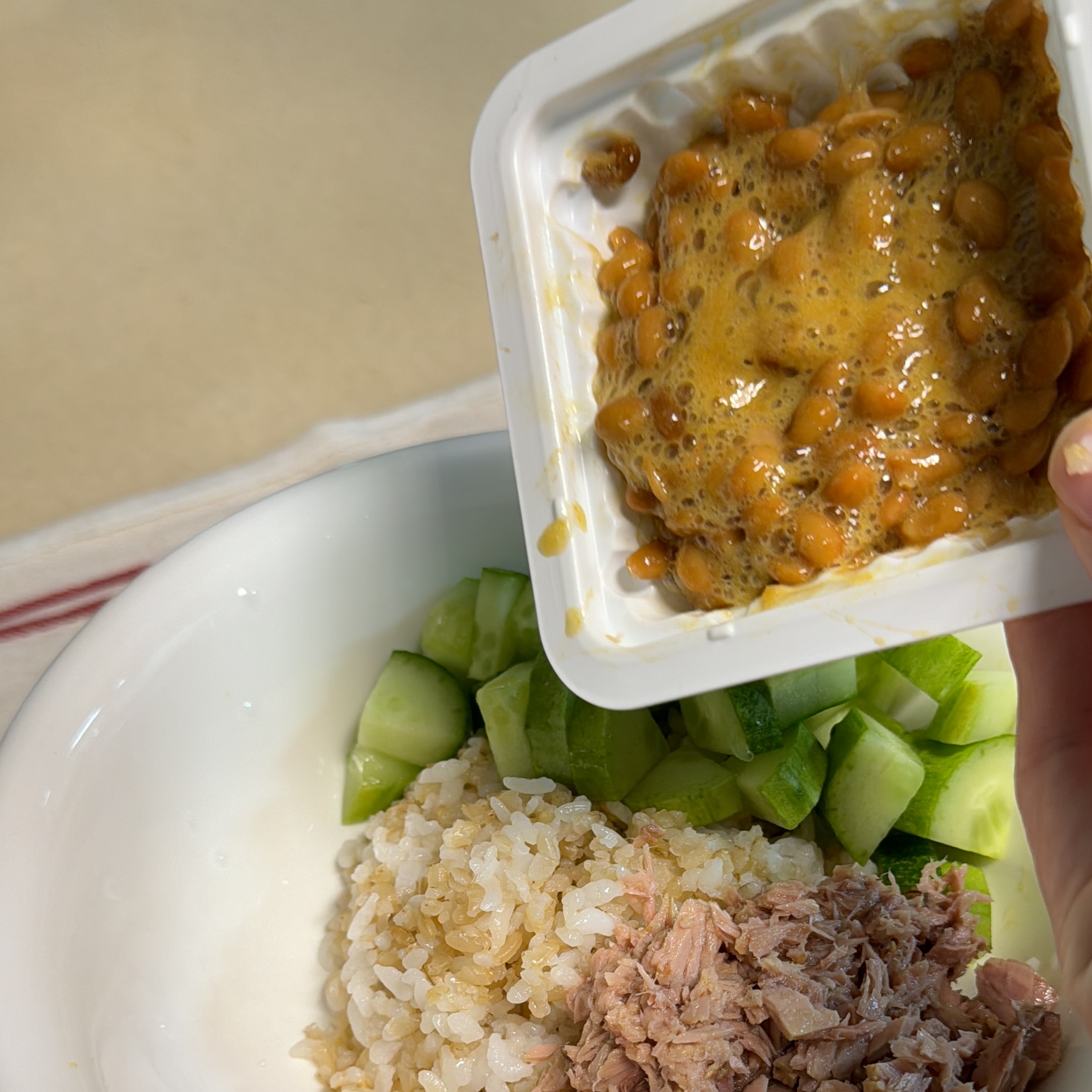 6. 볼에 현미밥-참치-낫또-오이 를 순서대로 올리고 들기름 소스를 잘 둘러준다.