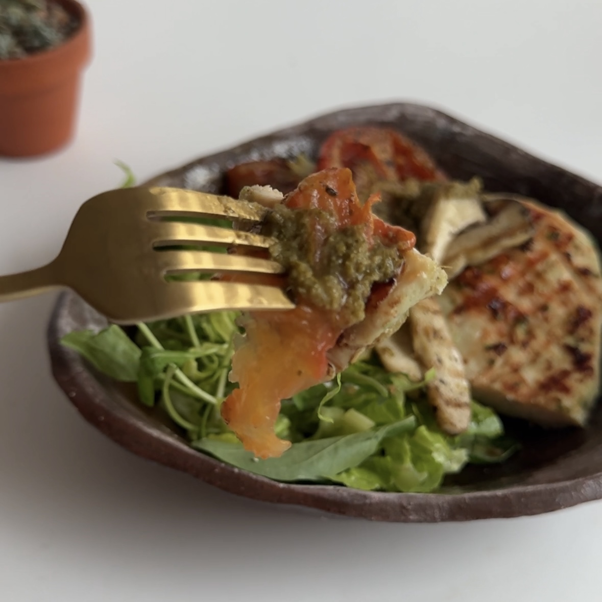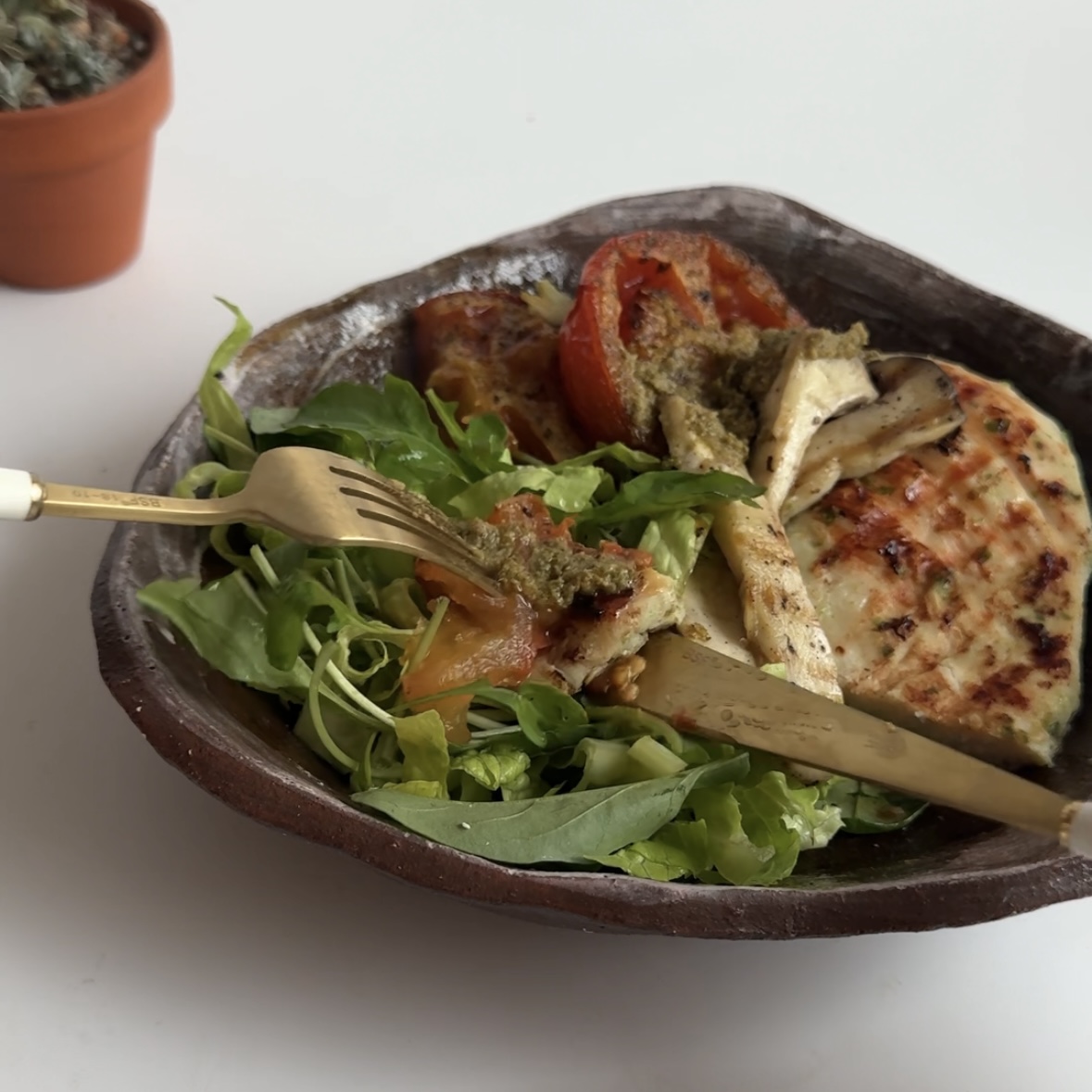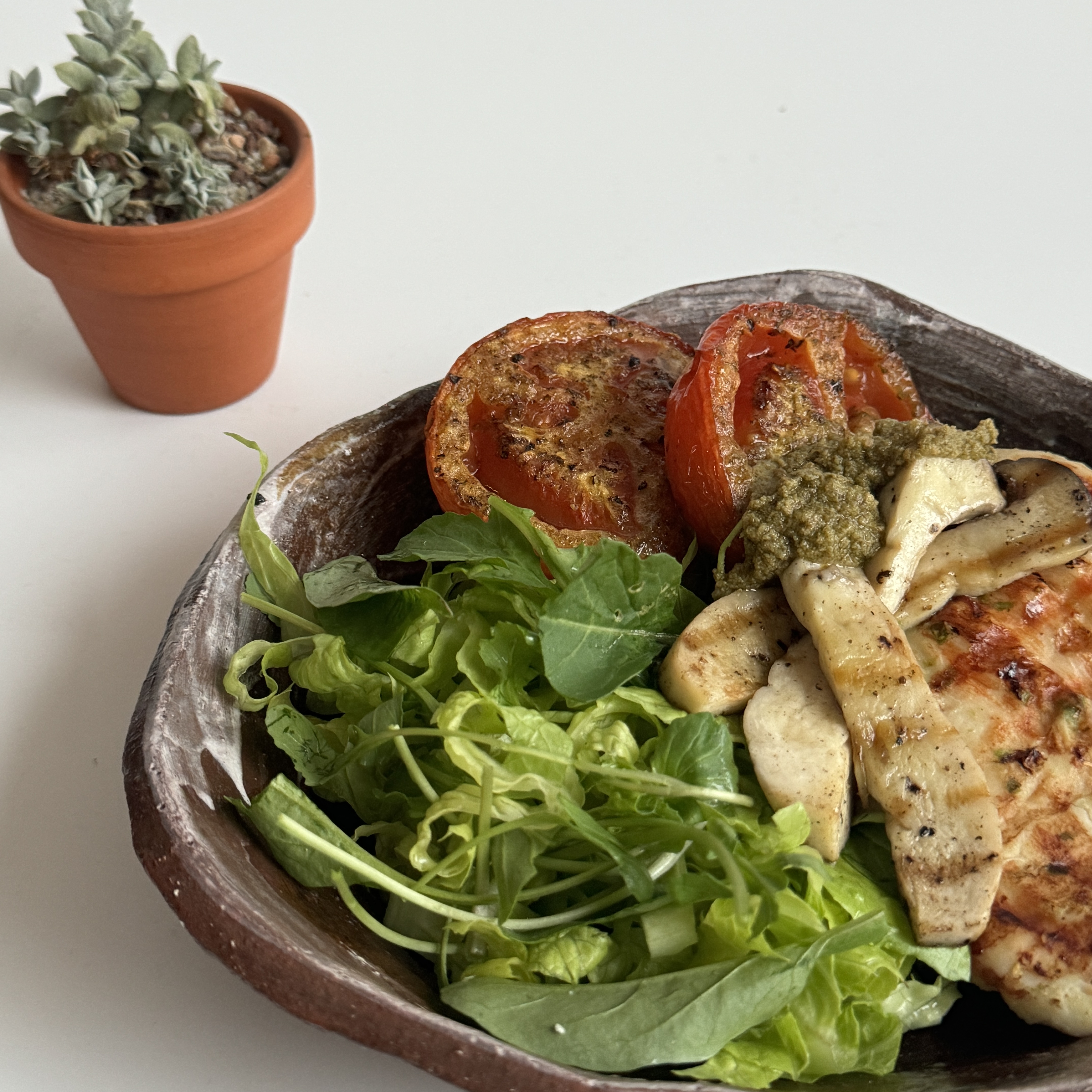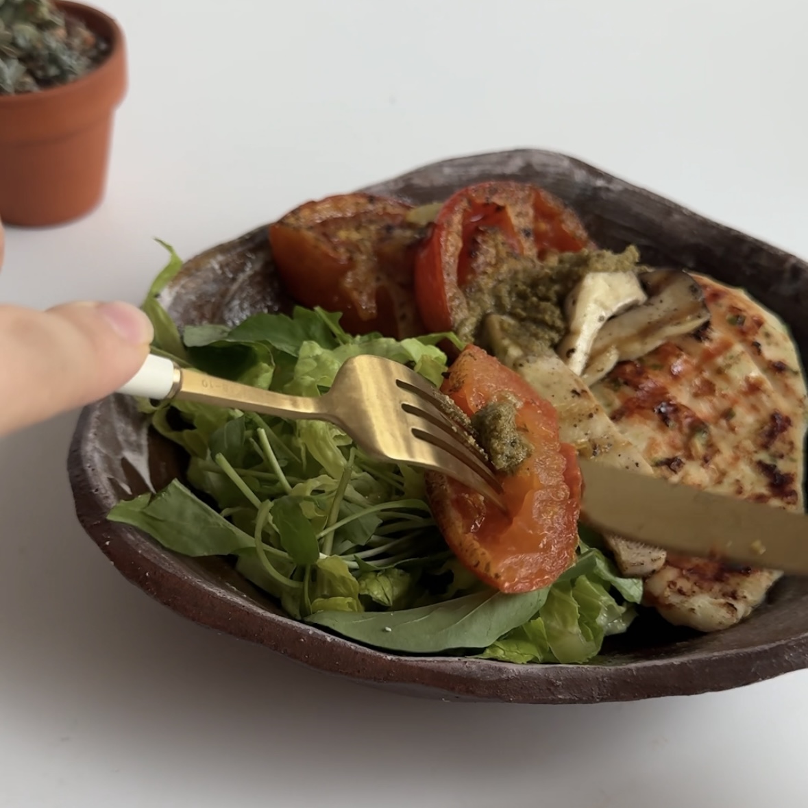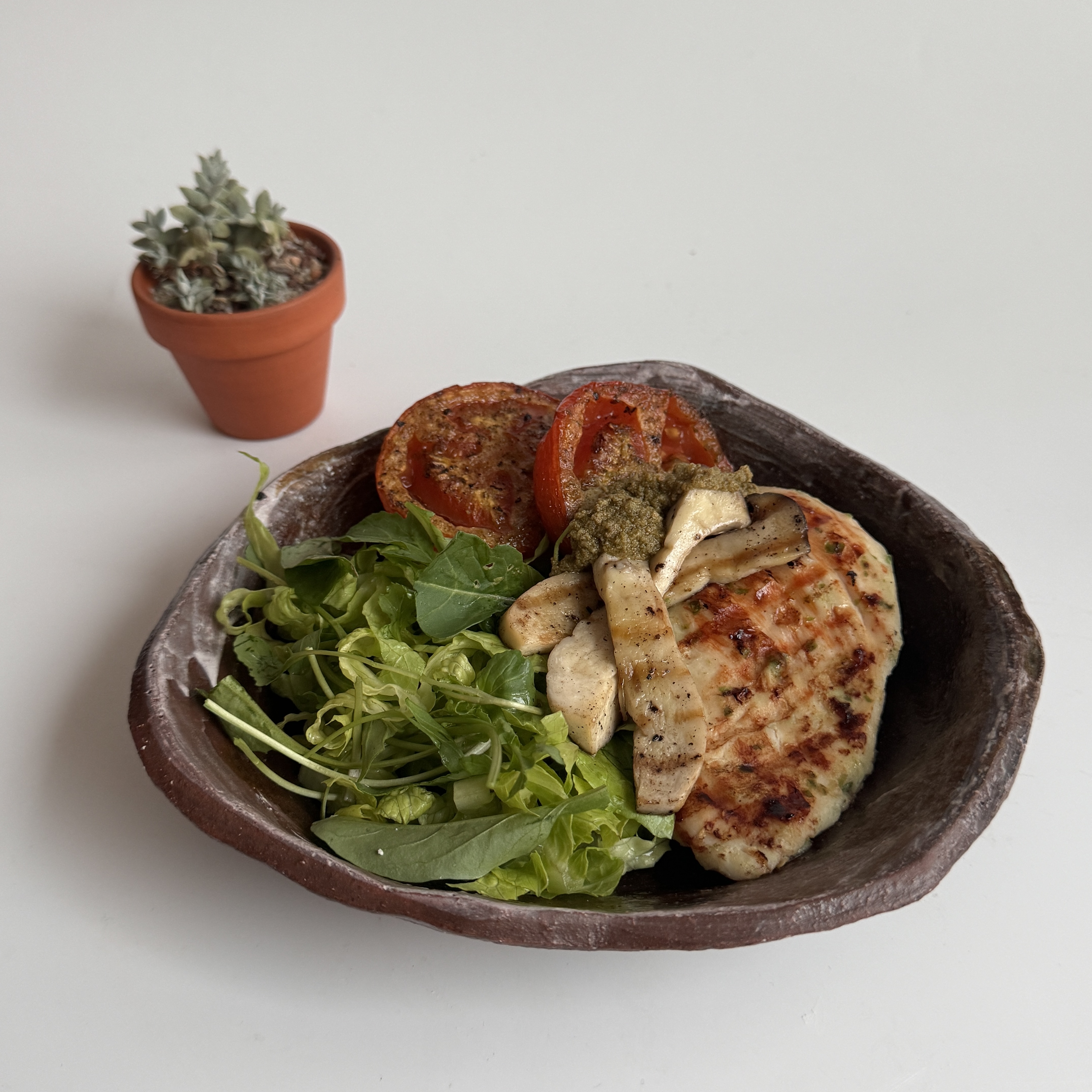 6. 플레이트에 믹스야채, 구운 닭, 버섯, 토마토 올리고